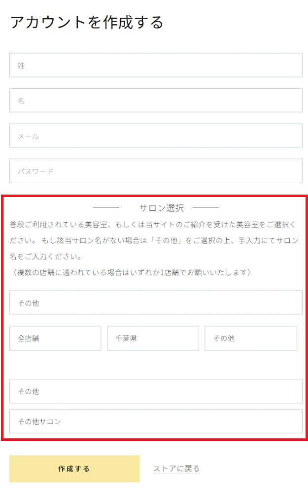 姓/名/メールアドレス/パスワードを入力して、ご利用のサロン情報を入力してください。